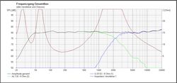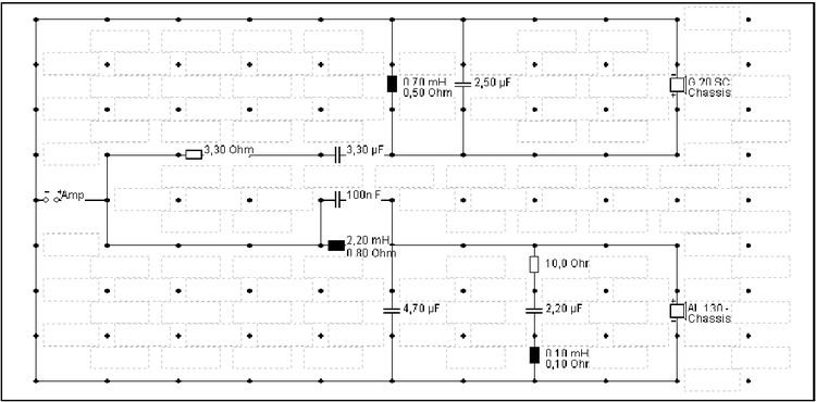Hochtonkondensators auf 3,3 Mikrofarad reduziert werden musste. Außerdem liegt in der endgültigen Version ein kleiner Kondensator von 0,1 Mikrofarad parallel zur Serienspule im