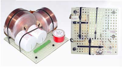 am Kondensator mit Schrumpfschlauch isoliert, um Kurzschlüssen vorzubeugen. Die Platine wurde auf den Gehäuseboden gelegt, anschließend C3 so weit wie möglich über L3 nach hinten