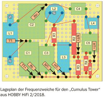 angeschlossen. Das Schaltbild zeigt dies korrekt. Im Lageplan der Frequenzweiche wurde bei den Anschlüssen für den Tieftöner diese Verpolung aber nicht berücksichtigt. Daher hier der korrigierte Lageplan:
