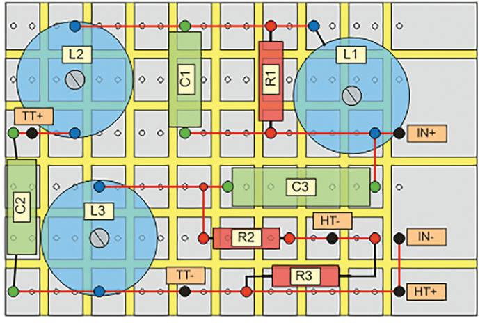 Erstellung des Lageplans für die Frequenzweiche nicht berücksichtigt; Hoch- und Tieftöner sind hier also gleichphasig eingezeichnet. Das trifft in diesem Fall nicht zu, gegenphasige Schaltung ist korrekt. Hier ist